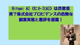 投資Hitomi AI(ヒトミAI)は詐欺投資?株式会社プロビデンスの危険な副業実態と悪評を暴露! こんにちは!長野芽衣です! AIを活用した投資サービスへの関心が高まる中、「Hitomi AI(ヒトミAI)」および運営元とされる株式会社プロビデンスに関する詐欺疑惑と悪評がネット上で急速に広まっています。 副業としても紹介されているこ... 2026.03.31投資