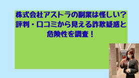副業株式会社アストラの「楽だけどズルくない!」副業は詐欺?口コミ・評判で危険性をチェック! こんにちは!長野芽衣です! 最近、SNSや広告で目にする機会が増えた株式会社アストラの「楽だけどズルくない!」という副業案件について、多くの方が気になっているようです。 しかし、この副業案件には多くの問題点が隠されており、安易に参加する... 2025.10.06副業